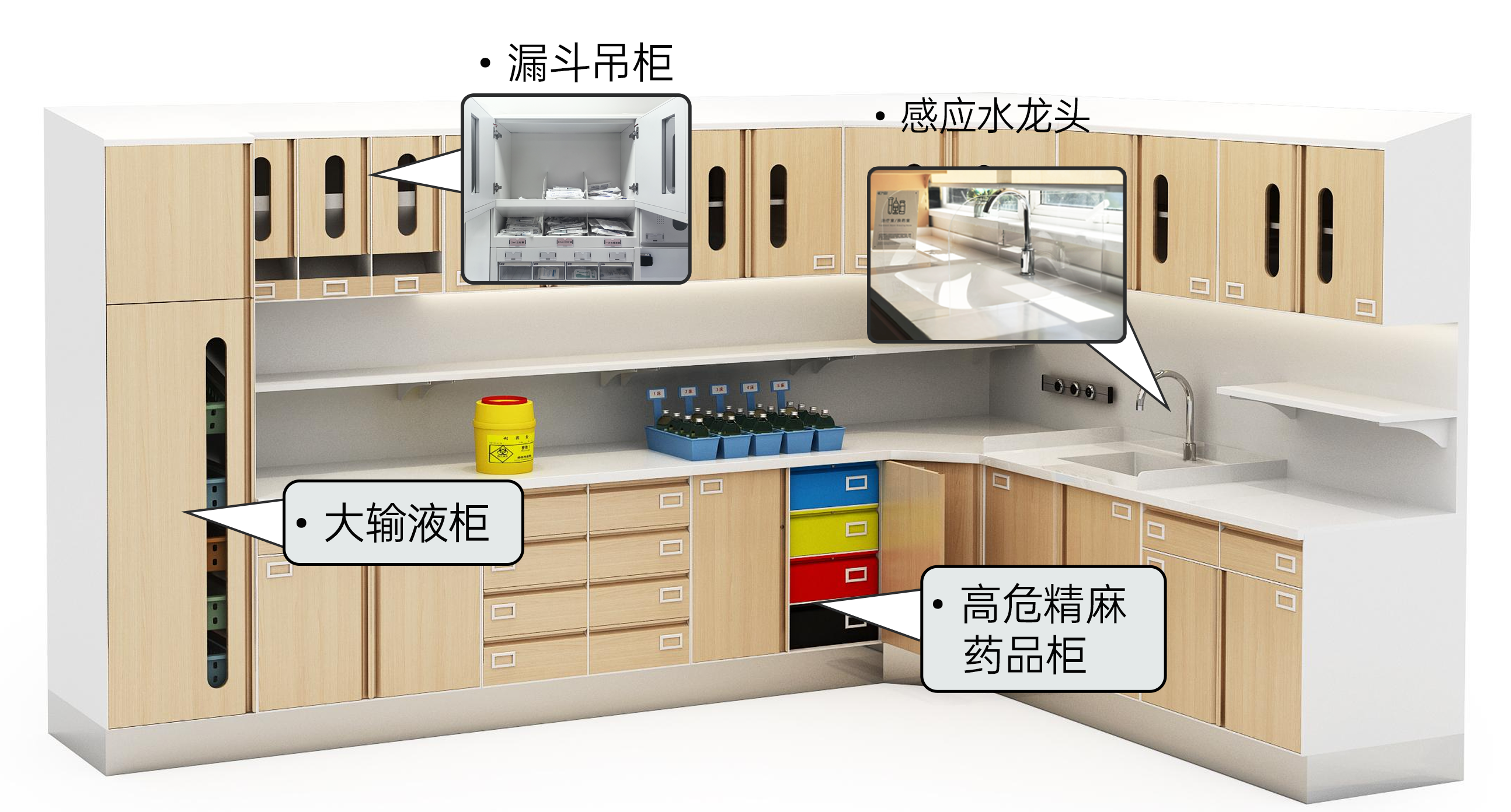 以治疗柜为例,其内部结构需贴合医护使用习惯。大输液柜、低耗物资存取柜、高危精麻药品柜根据空间和需求自由组合,方便实际使用;针管、棉签、纱布等常用耗材,采用漏斗式吊柜设计,能自动做到“先进先出”,先放进去的耗材靠前,不会积压过期,减少整理时间;洗手池则使用感应水龙头,通过脚踏/感应打开,医护人员无需手触,既避免污染,又提升操作连贯性。