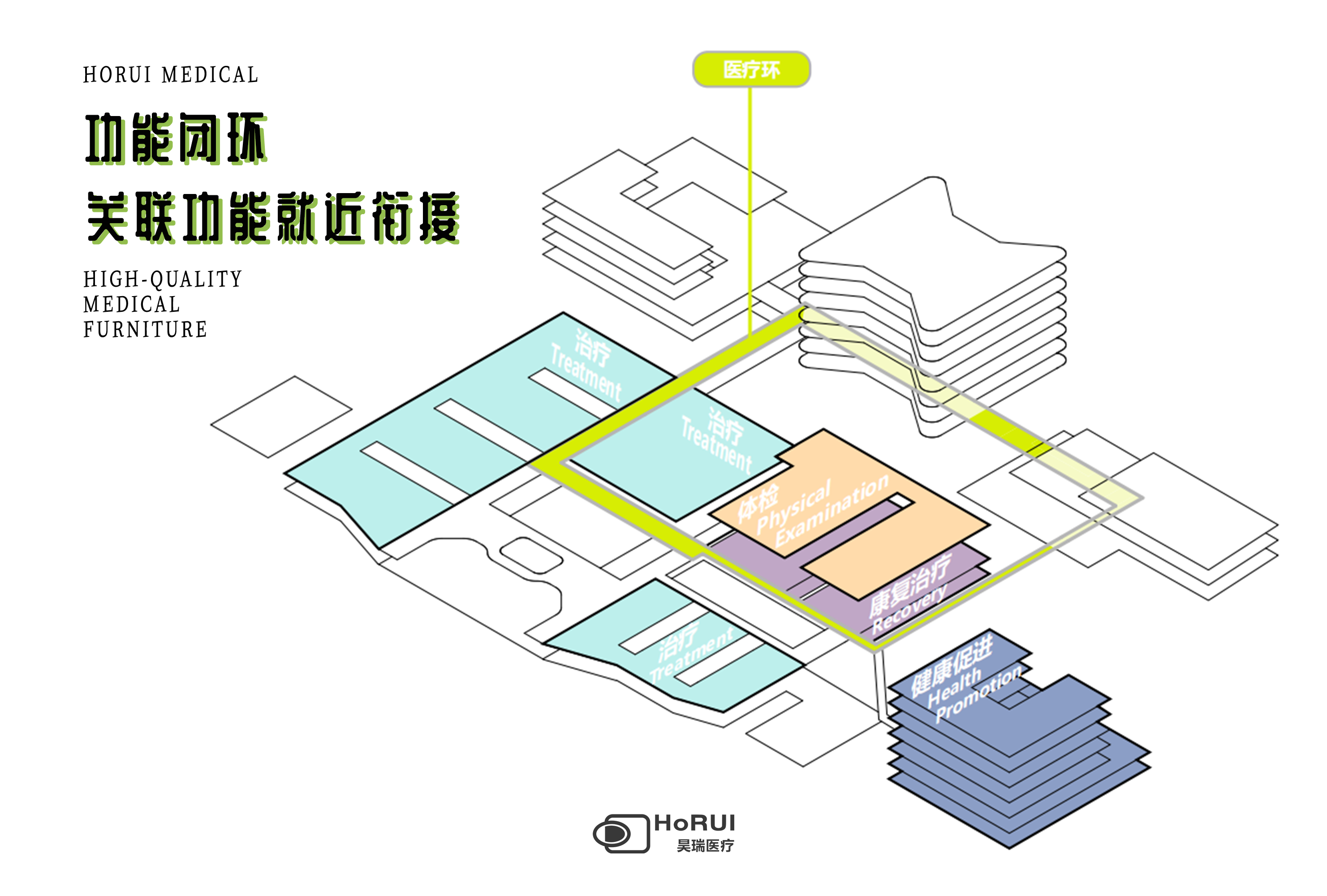 在医疗空间中,医疗家具并非孤立的陈设,而是与医护人员诊疗行为、患者康复行为、家属陪护行为深度绑定的功能载体。昊瑞医疗的医疗家具设计布局突破 “功能堆砌” 的传统思维,以行为需求为导向,构建适配医疗场景的空间秩序。