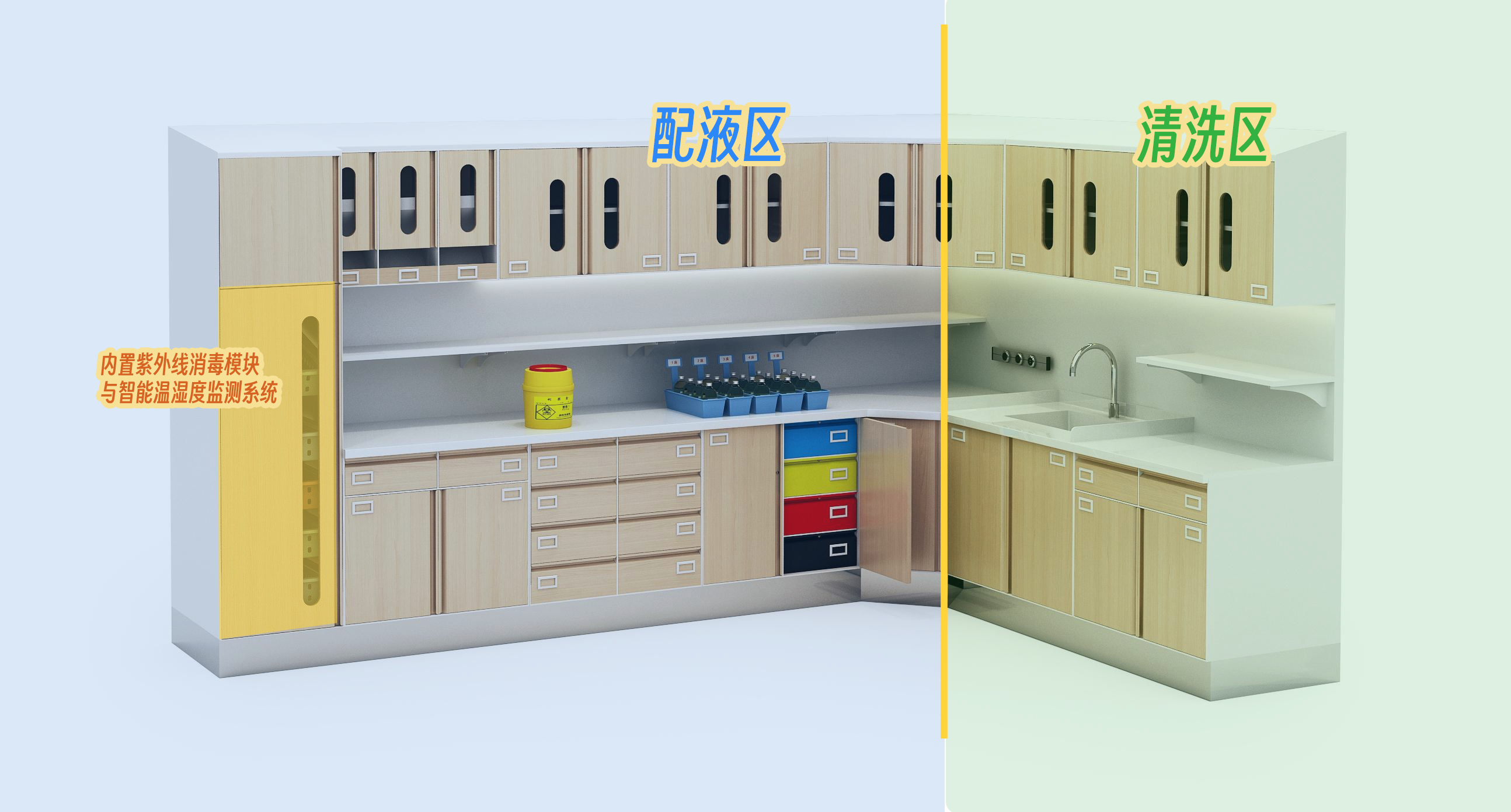 针对治疗柜药品器械混放、消毒流程难标准化等痛点,医疗家具创新采用"人体工程学-操作流程-院感标准"三维协同设计,将治疗柜精准划分清洁区、配液区,内置紫外线消毒模块与智能温湿度监测系统,如同为诊疗空间穿上"无菌铠甲",实现从"被动整改"到"主动防控"的转变。